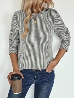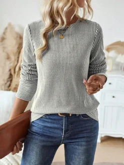 Women Casual Striped Round Neck Long Sleeve Loose T-Shirt, Autumn